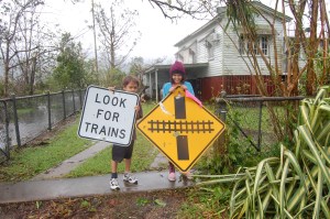 Some sign posts that blew into our yard – look out for trains, what about look out for cyclones (c) June Perkins