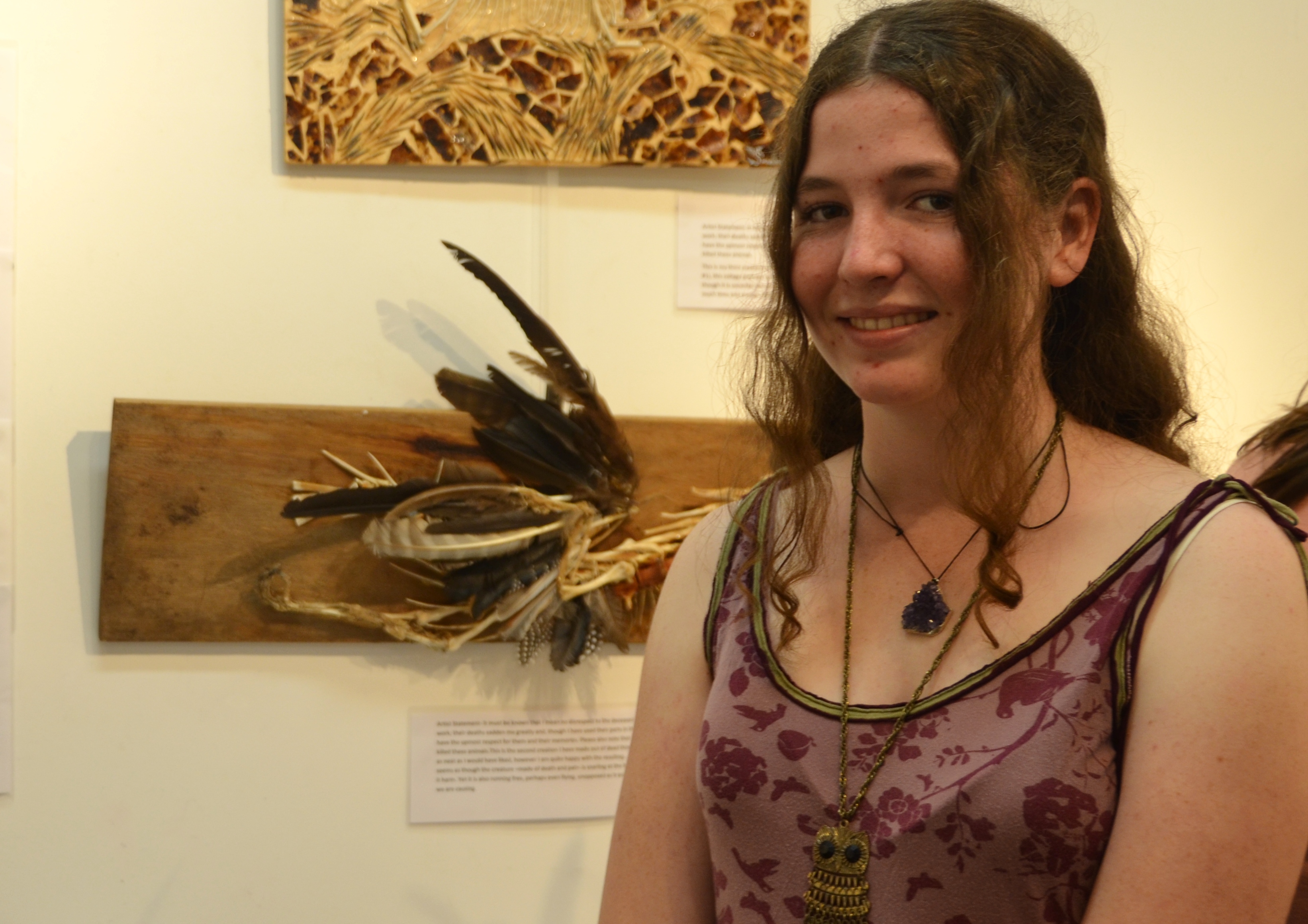 Sonya had striking social commentary in some of her pieces, and a note about how she had obtained bones from animals to construct one. Caitlin created delightful bird paintings on feathers amongst her three contributions. Sheridan’s mixed media wall had several digital art pieces, as well as a collage and some canvas work.