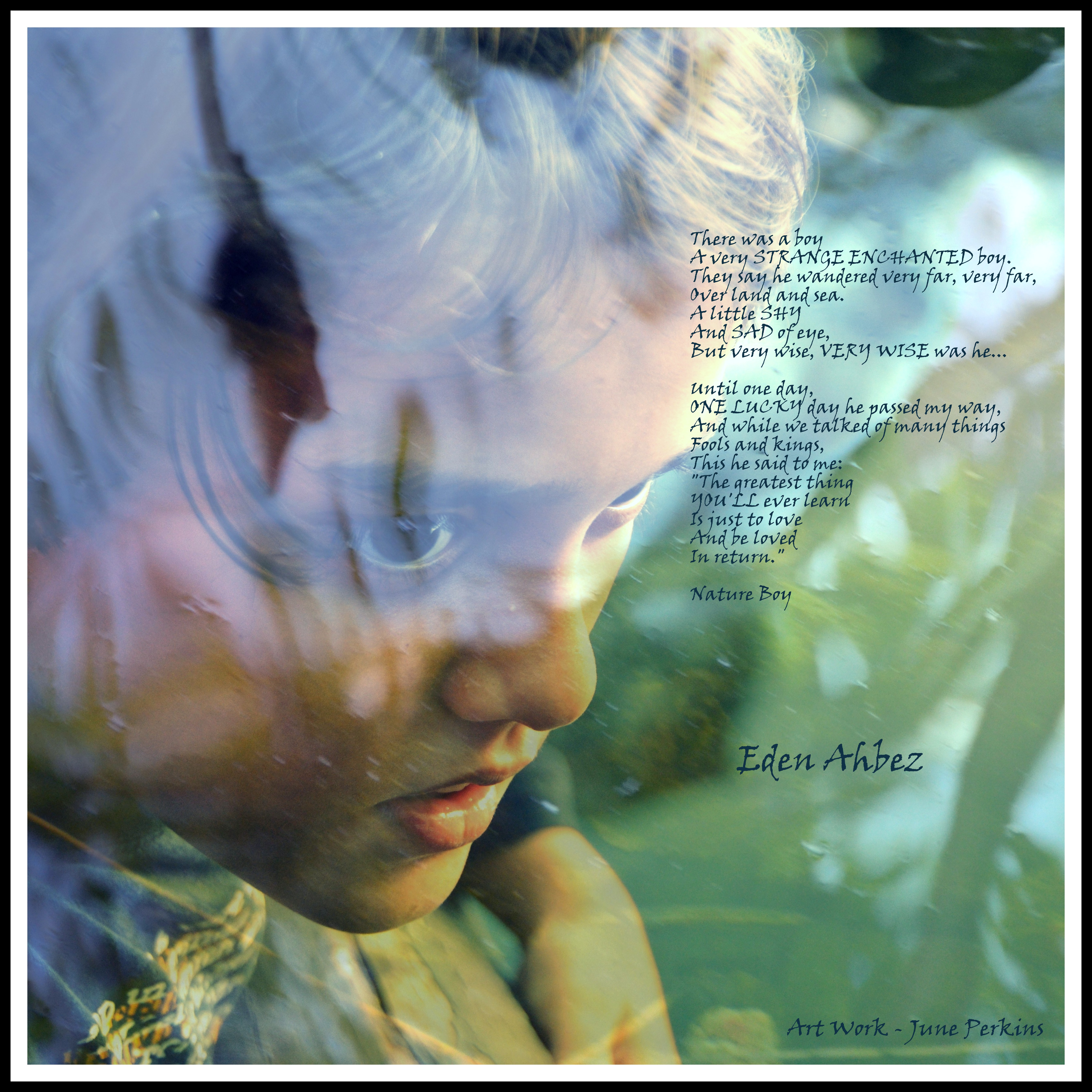 The poster words were recorded by Nat King Cole. Nature Boy“is track #10 on the album The World Of Nat King Cole. It was written by Ahbez, Eden but made famous by Nat.