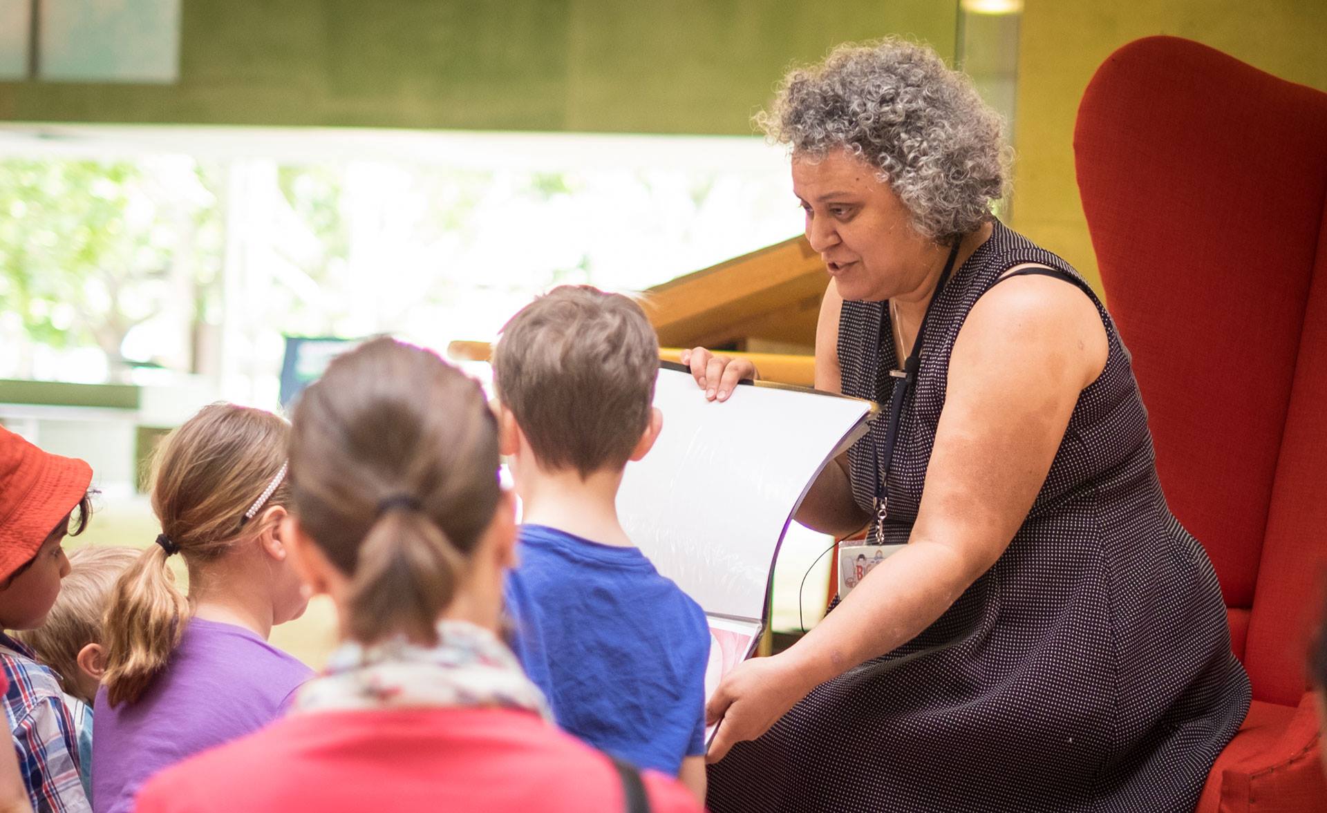 Perched comfortably in a super red story chair, miked up, and with a red mat for families to sit on, I read three poems, ‘Wishing For A Fish,’ ‘Beyond Caterpillar Days’ and ‘Discovering Magic.’
