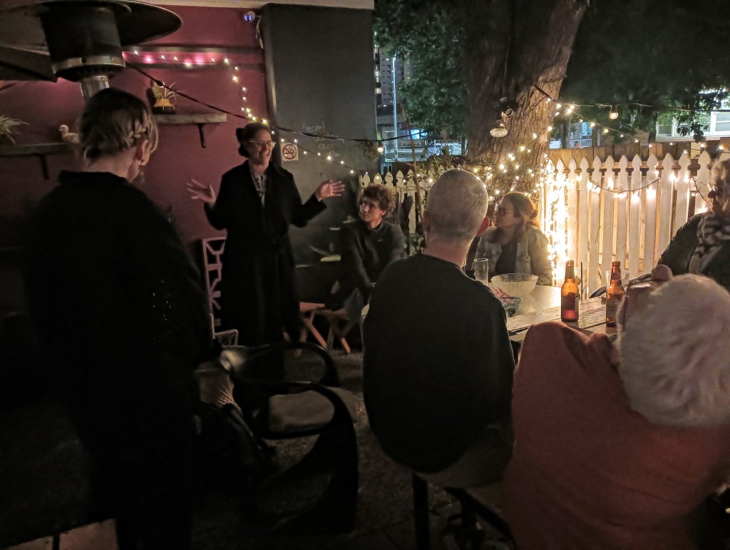 We heard her read at the Open mikes (there were no microphones though, just attentive readers) only after all of us had read (these were held shortly after the workshops, with many of us choosing to go, although some couldn’t make these) and some of us at a Quills and Passionate member Soiree event.